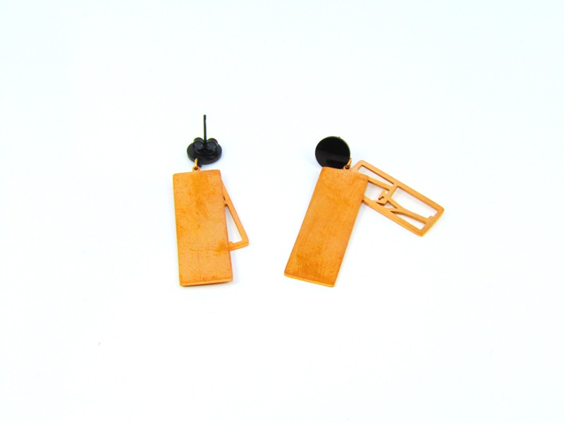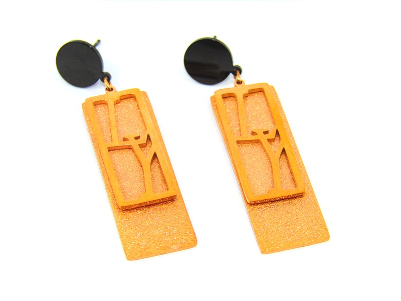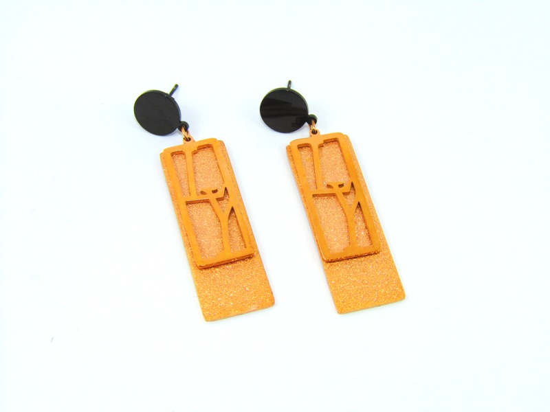 Εντυπωσιακά κρεμαστά γυναικεία σκουλαρίκια, σε χρώμα ροζ χρυσό, με κυκλική μαύρη βάση στην κορυφή και σχεδιασμένα με ένα ορθογώνιο που έχει glitter στην επιφάνεια και με ένα μικρότερο ανάγλυφο ορθογώνιο το οποίο κινείται και περιλαμβάνει τα αρχικά LY (σ'αγαπώ στα αγγλικά).