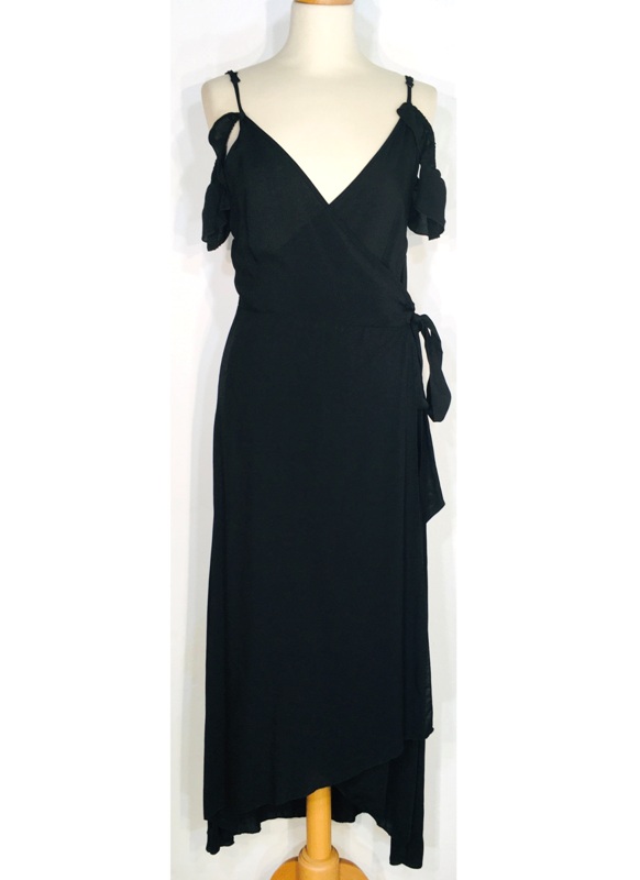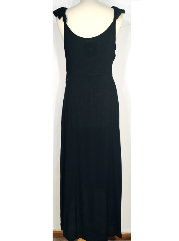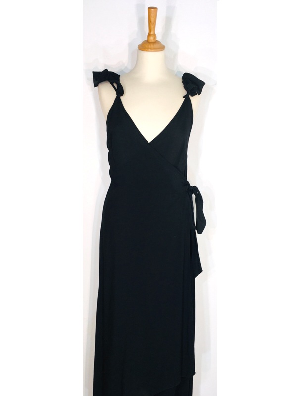 Εντυπωσιακό γυναικείο αμάνικο φόρεμα, μίντι, ελαφρύ, μονόχρωμο και ριχτό, σχεδιασμένο με V ντεκολτέ. Αποτελείται από δυο πλευρές που δένονται με ασορτί υφασμάτινη ζώνη. Διαθέτει ρυθμιζόμενες τιράντες και μικρό βολάν πάνω τους, έχει άνισο τελείωμα.