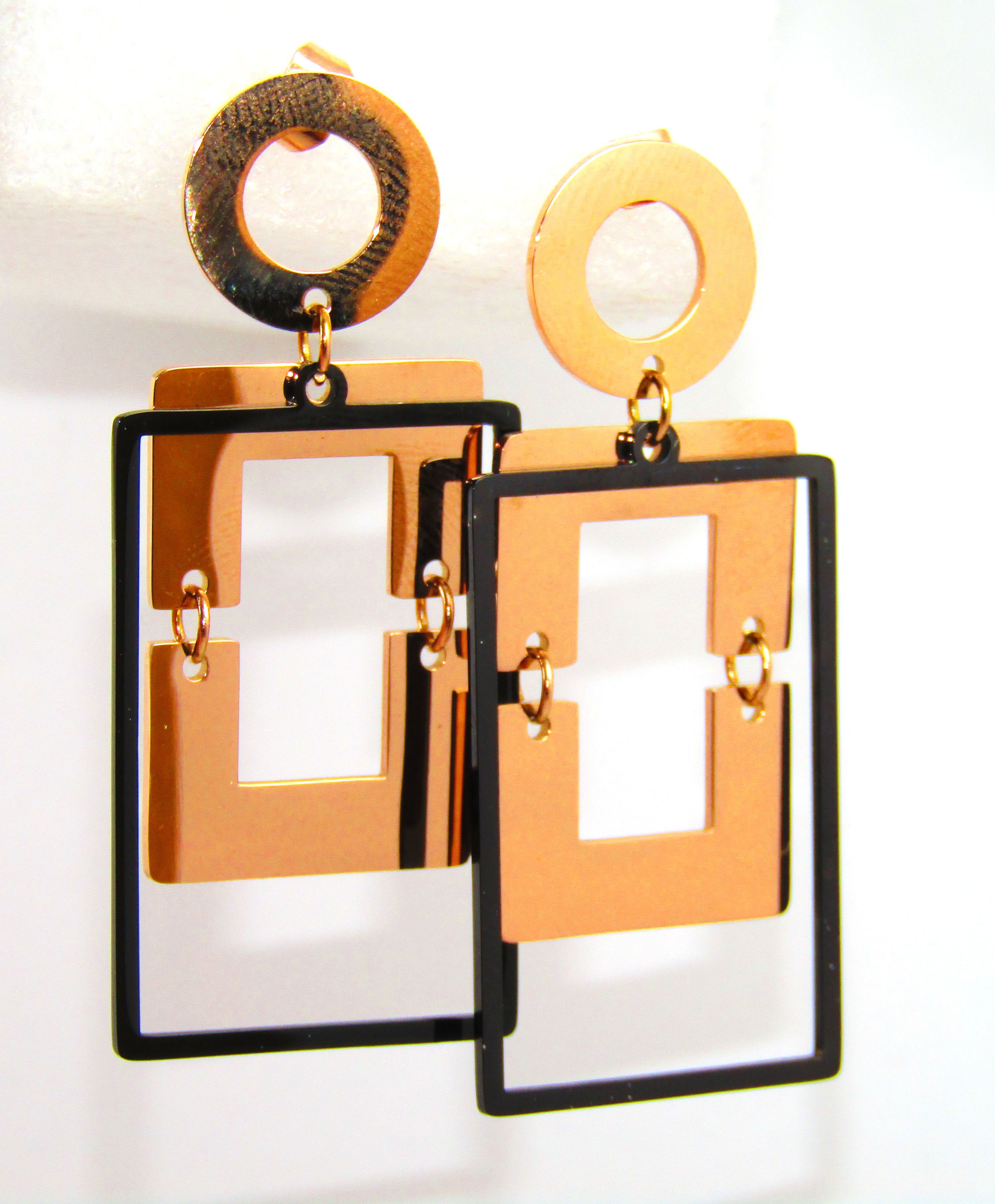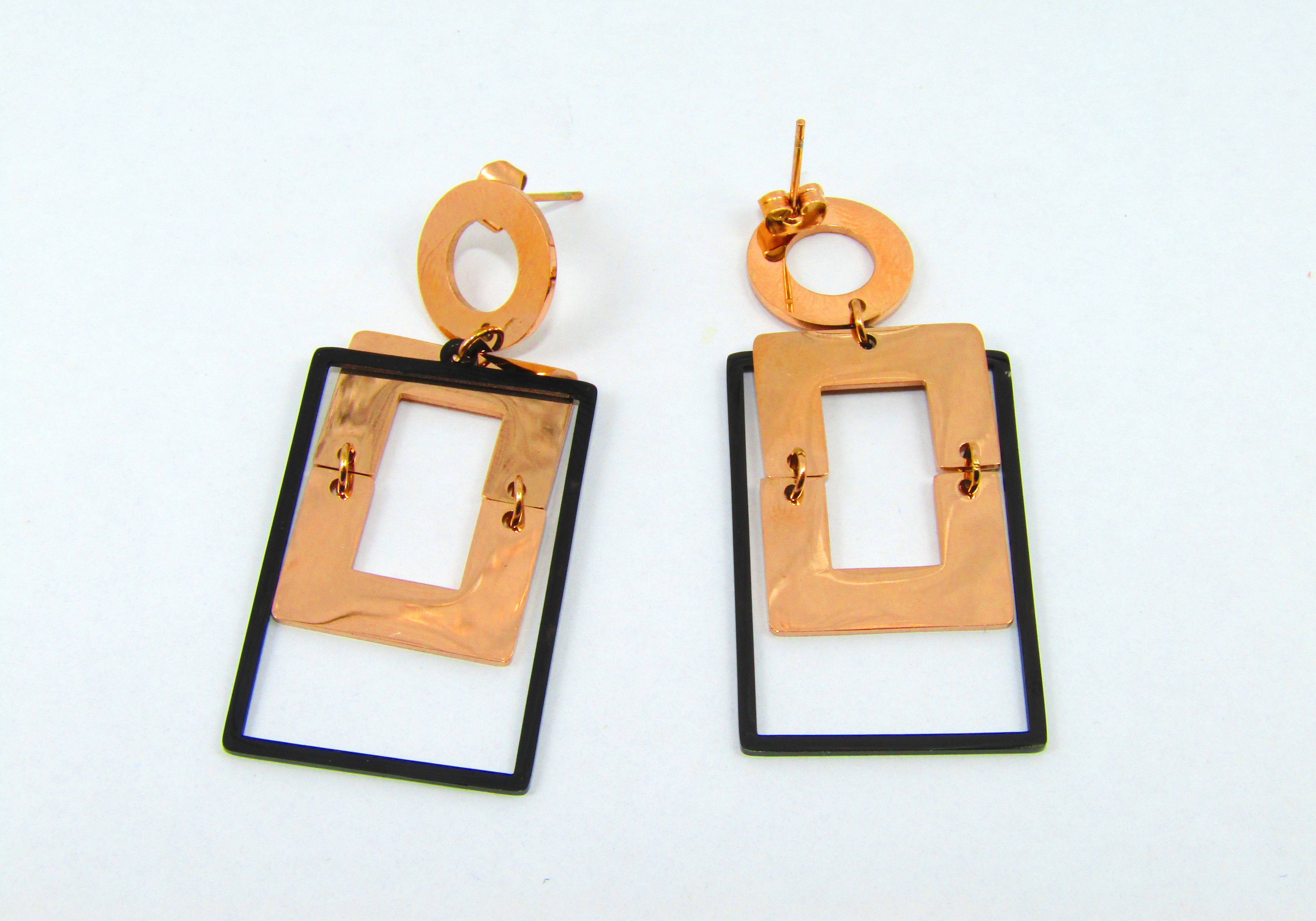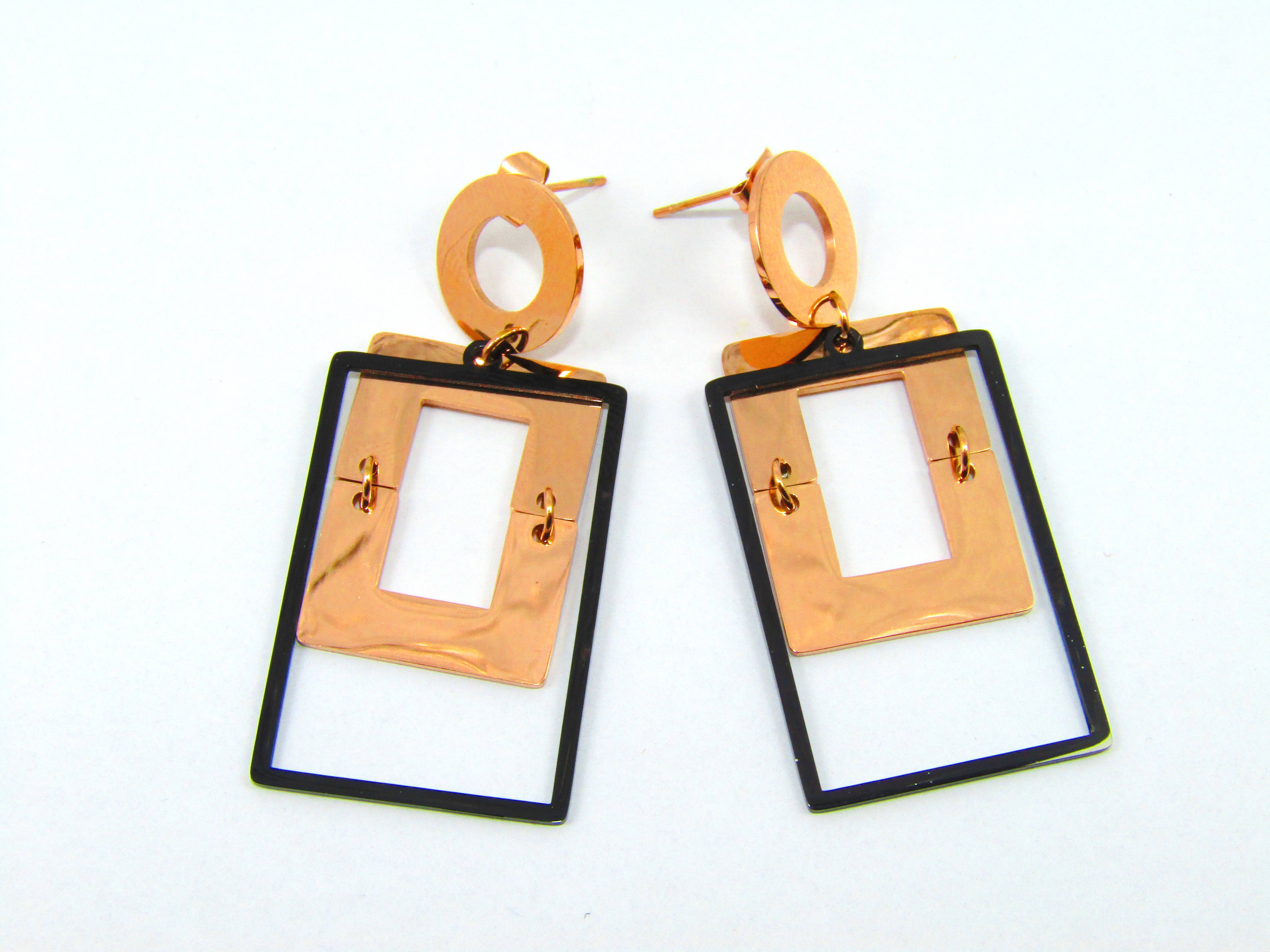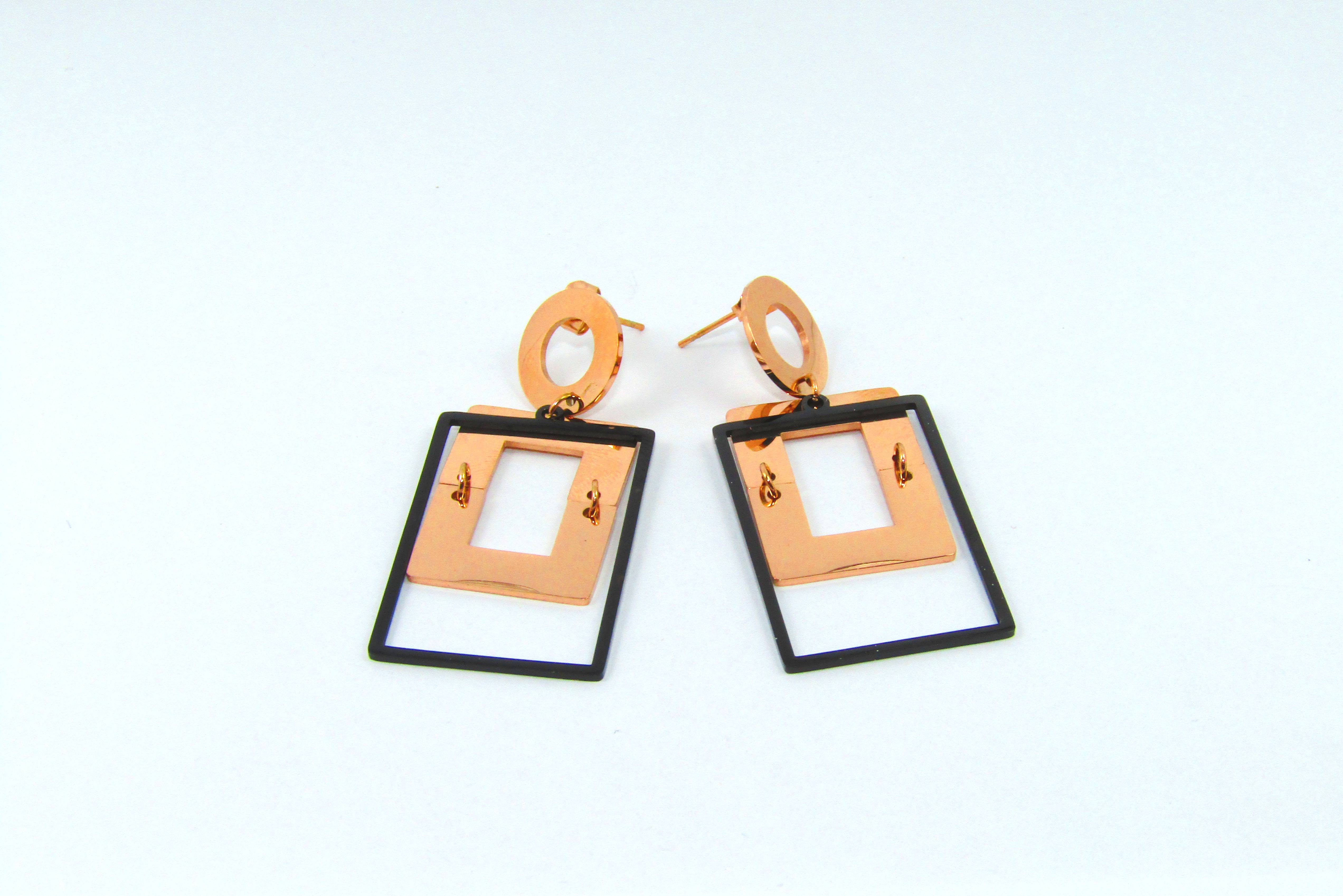 Εντυπωσιακά κρεμαστά γυναικεία σκουλαρίκια, συνδεδεμένα σε δύο διαδοχικά ανοιχτού τύπου ορθογώνια, το ένα μεγαλύτερο και μαύρο με λεπτό πλαίσιο ενώ το άλλο μικρότερο σε ροζ χρυσό διακεκομμένο στη μέση και πιο χοντρό πλαίσιο. Η βάση του κουμπώματος τους είναι ένας χοντρός κρίκος για πιο ωραίο εφέ.